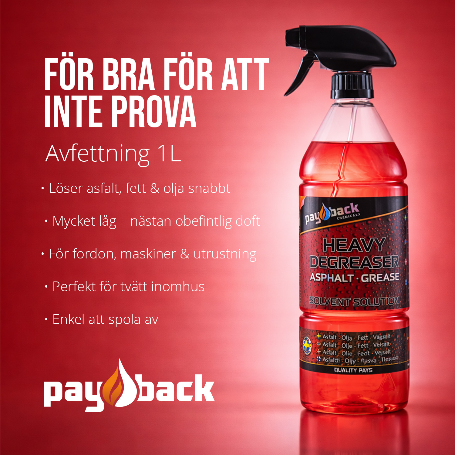 Heavy Degreaser 1 L löser asfalt, tjära, salt, olja och annan petroleumbaserad smuts. Perfekt som första steg i tvätten för att få bort den grövre smutsen innan handtvätt.