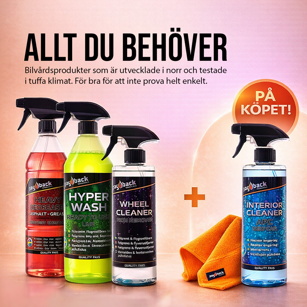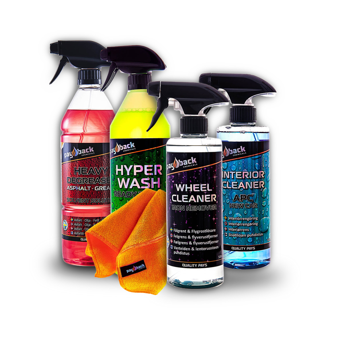 Med det här startpaketet blir din bil riktigt ren. För att få bort normal smuts, trafikfilm, bromsdamm och invändig smuts krävs rätt produkter i rätt steg. Här har vi samlat allt du behöver för att göra en komplett rengöring – både utvändigt och invändigt.