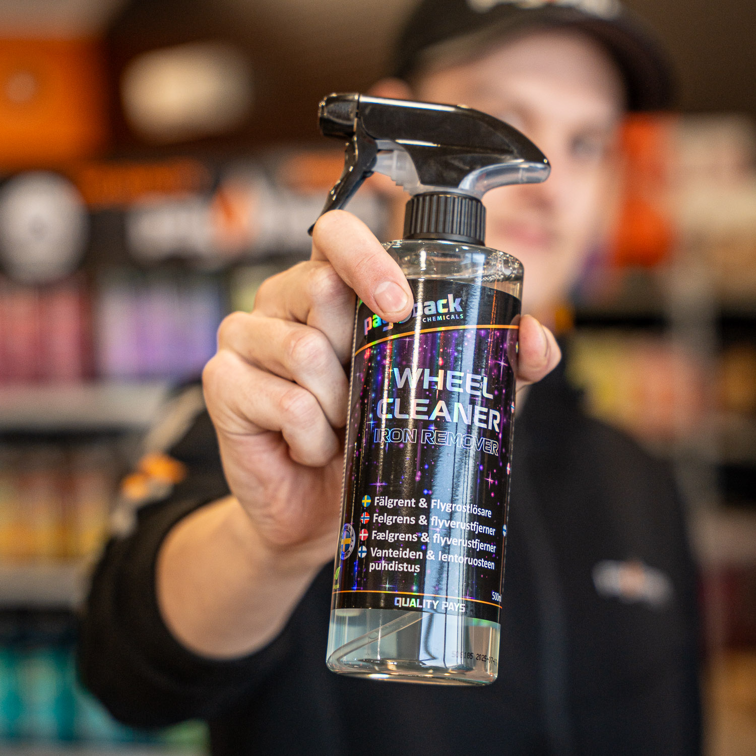 Medlet reagerar med järnpartiklar och en tydlig färgskiftning till lila uppstår vid aktivering. Löser effektivt smuts och fastbrända järnpartiklar från fordonslack och fälgar.